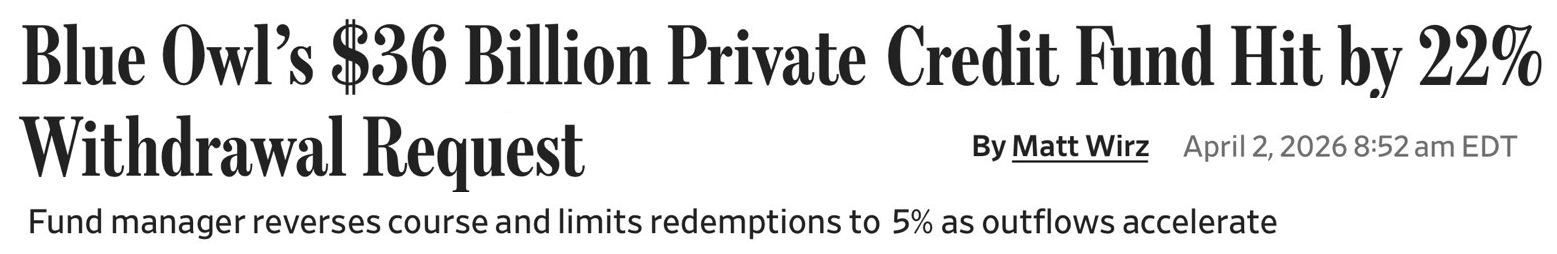 Rares sont ceux qui vont jusqu'à 70% selon le Financial Times: " Le géant du crédit privé Blue Owl Capital a été frappé par une augmentation « colossale » de 5,4 milliards de dollars des demandes de rachat au T1 2026."