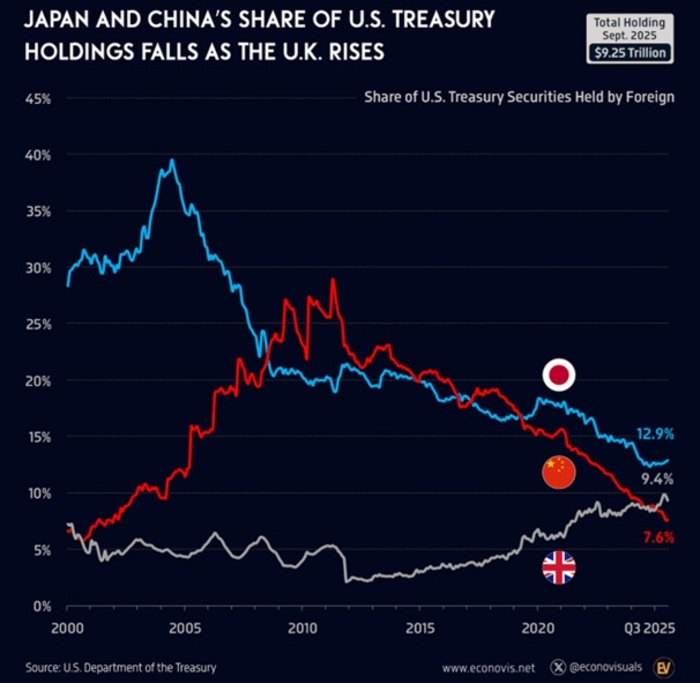 Idem pour la Chine qui continue à vendre ses Bons du Trésor américains et transforme ces dollars en métaux.