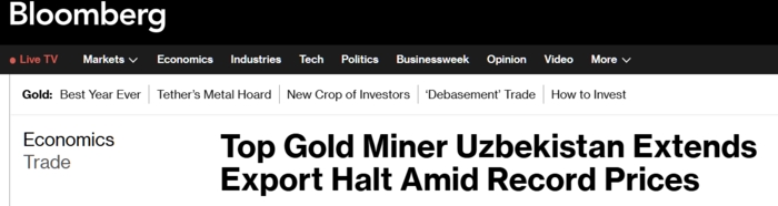 La même décision a été prise par l'Uzbekistan, 10e exportateur mondial, aucun lingot d'or ne quittera le pays jusqu'à nouvel or, ce qui signifie que tout le monde s'attend à une aggravation des hostilités, lire ici Bloomberg.