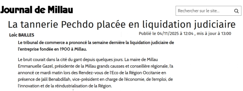 Pechdo France tannerie à Millau licencie 33 salariés suite à la liquidation judiciaire "Pechdo était la dernière tannerie encore en activité à Millau, spécialisée dans le tannage de peaux bovines et caprines, perpétuant un savoir-faire séculaire qui a fait la réputation de la ville bien au-delà de ses frontières." 2025-nov