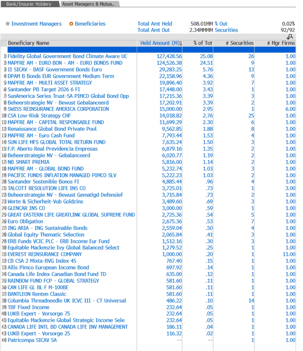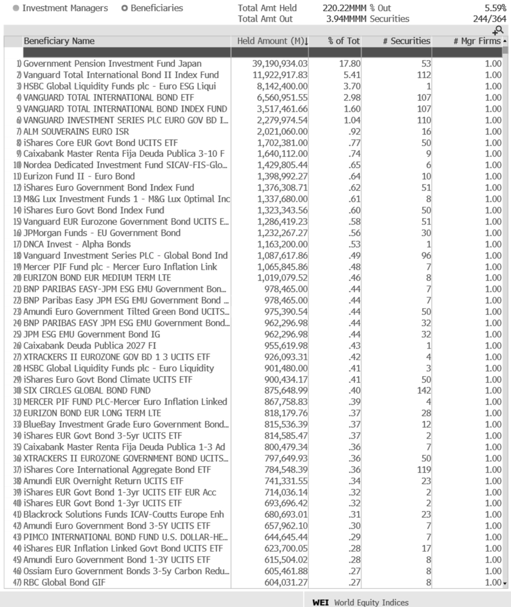 Alors qui achète la dette de la France. L'un de nos lecteurs bien placé nous a envoyé cette liste, examinez-la bien, Vanguard et autres sont bien présents dont la Bank of Japan qui achète notre dette avec sa photocopieuse!