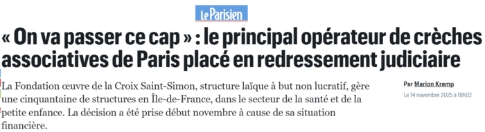 Oeuvre de la Croix Saint-Simon France qui gère 50 crèches à Paris a été placé en redressement 2025-nov