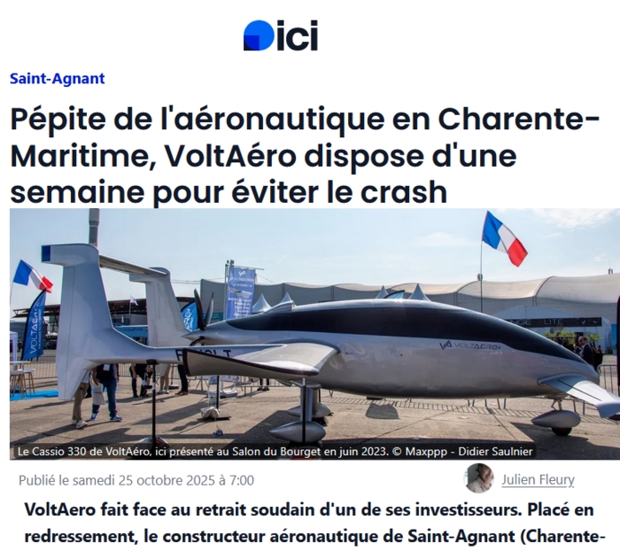 VoltAero France avions hybrides (carburant-électrique) la start-up de Saint Agnan en redressement judiciaire avec 35 emplois 2025-nov