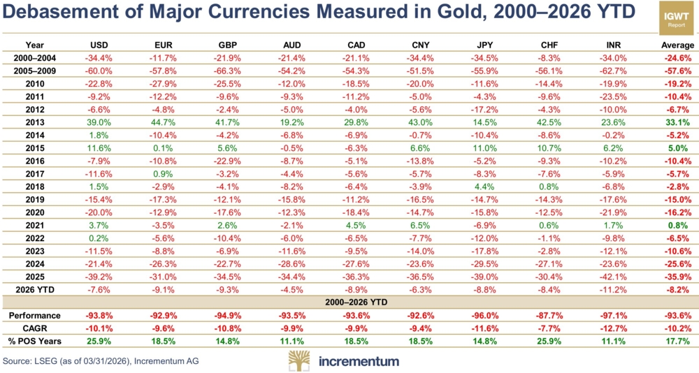 Ceux qui attendent un effondrement monétaire ont déjà raté les 95 premiers % de l'effondrement des monnaies mondiales face à l'or: USD a perdu 93.8% - EUR a perdu 92.9% - GBP a perdu 94.9% - AUD a perdu 93.5% - CAD a perdu 93.6% - JPY a perdu 96% - CHF a perdu 87.7%, etc., etc. La moyenne de la perte est de 93.6% »