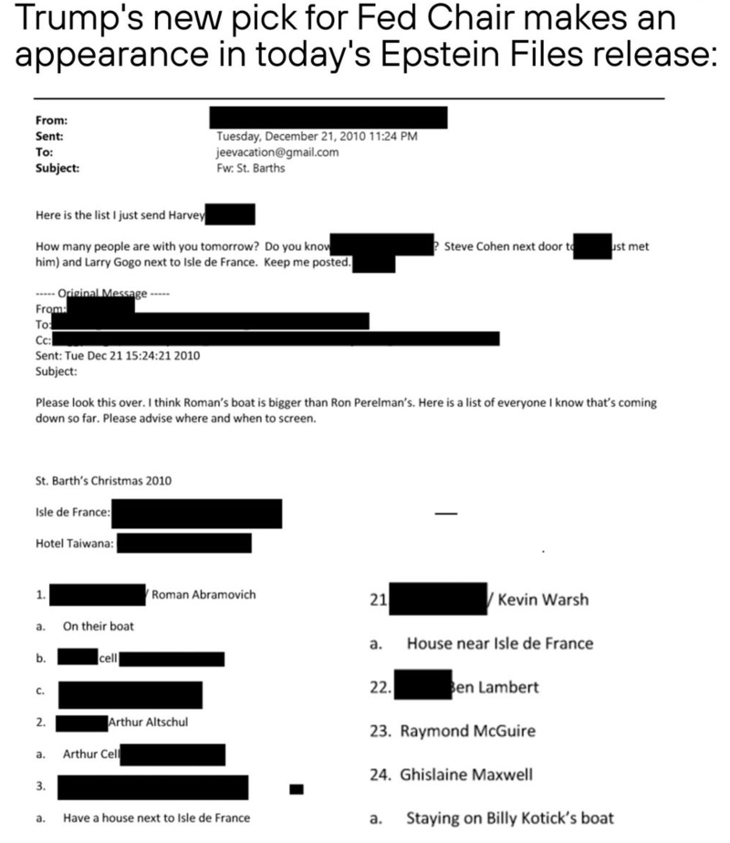 Depuis, Bank of America a payé aux victimes 56 milliards, JP Morgan 27, la Citi 15, la Wells fargo 11, la Deutsche 10 et Goldman Sachs 8 milliards de dollars. Et ceux qui en profitent encore son ceux que Epstein a mis sur son testament: à Karyna Shuliak (sa préférée) 10 millions, à Jean Luc Brunel et Darren Indyke 5 millions, 2 à son comptable Richard Kahn, 1 million à son pilote sachant que 4 noms (dont celui de Caroline Lang) ont été caviardés.