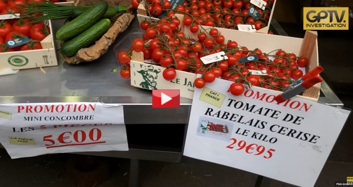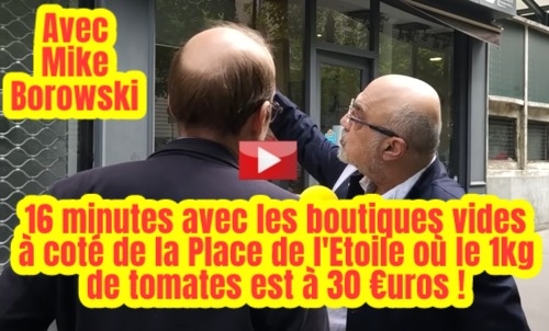 Promenade Av McMahon dans le Triangle d'Or à 15 mètres de l'Arc de Triomphe en compagnie de Mike Borowski avec les boutiques vides et les 30 euros pour 1 kilo de tomates